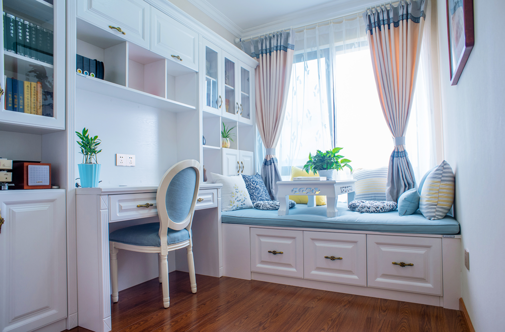 實(shí) 景 拍 攝 書 房 書房采用的也是白、藍(lán)色調(diào),光鮮明亮