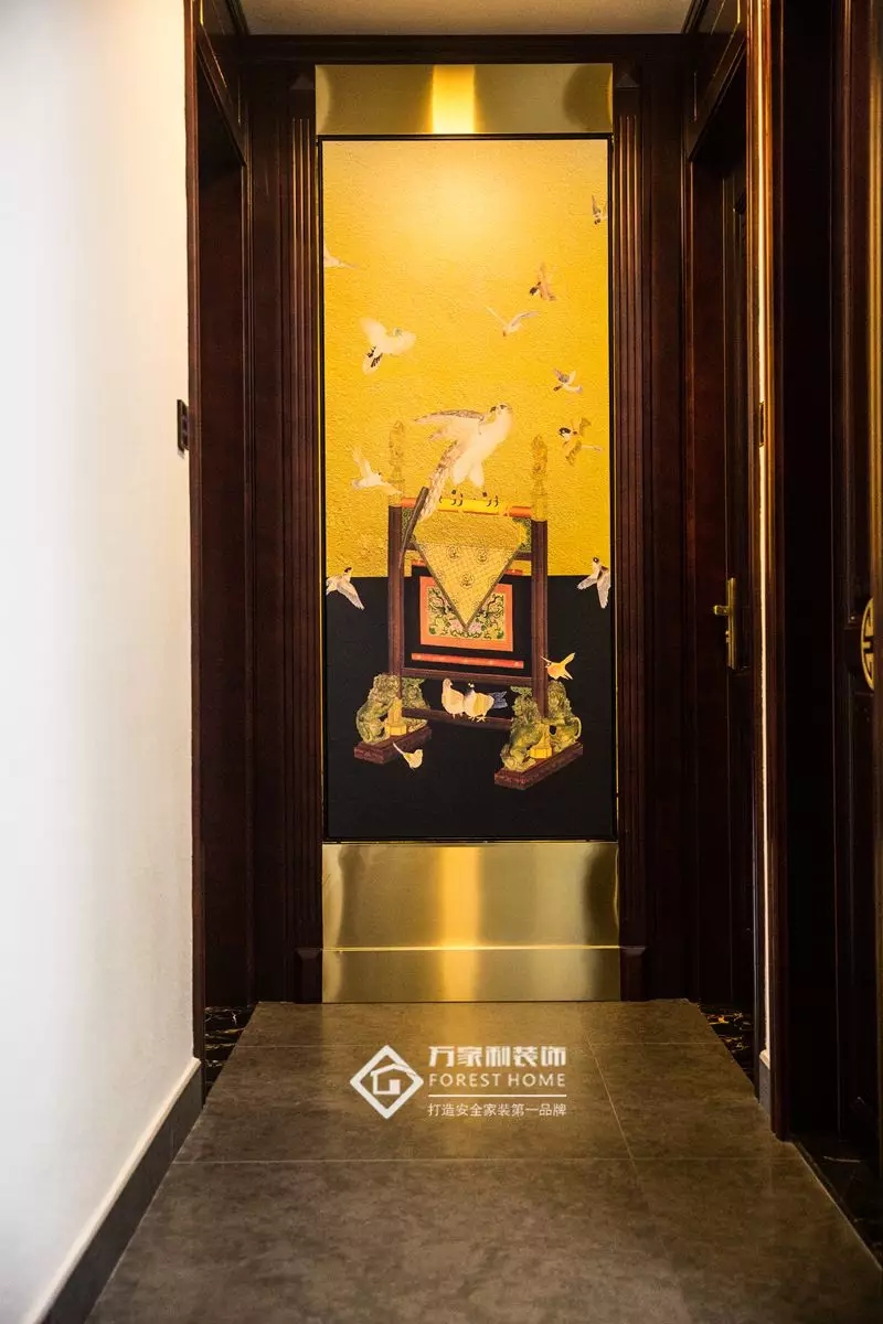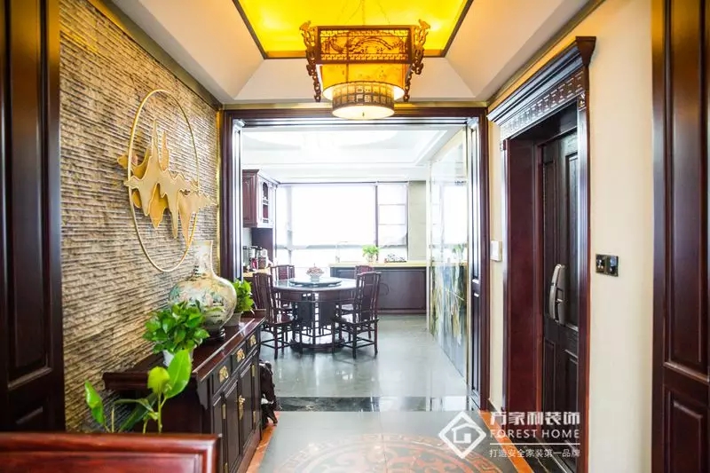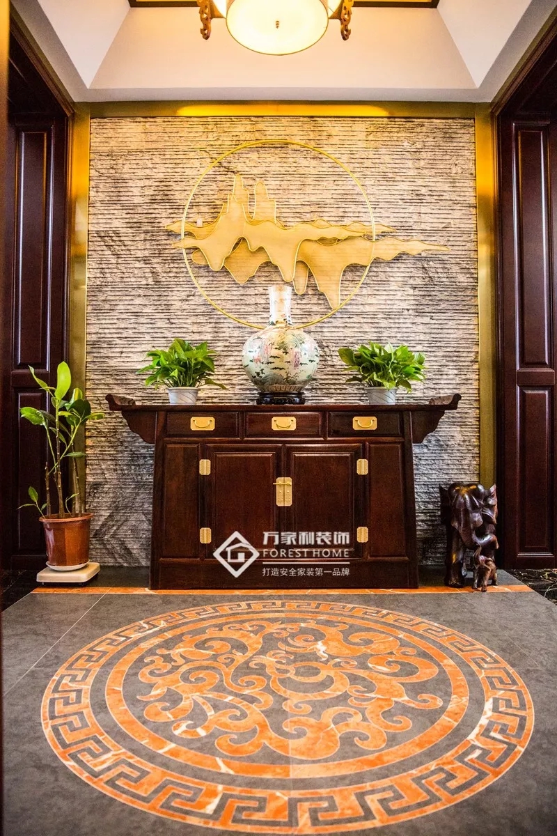 進門玄關,以紅棕色與金色搭配為主調,彰顯大氣穩重,擺放花瓶寓意著出入平安,可見細節。 瓷器古玩的裝飾雖然不多,但卻畫龍點睛的點綴了整體空間,這些工藝品體現了濃郁的東方之美,制造了極具中國文化內涵的空間氛圍。