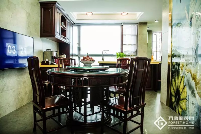 廚房餐廳無阻隔全開放設計,開敞式空間布局沉穩大氣,視覺上空間更為開闊,家具基調配合紅棕色主色,中式風味濃郁。