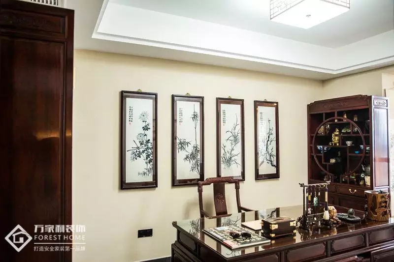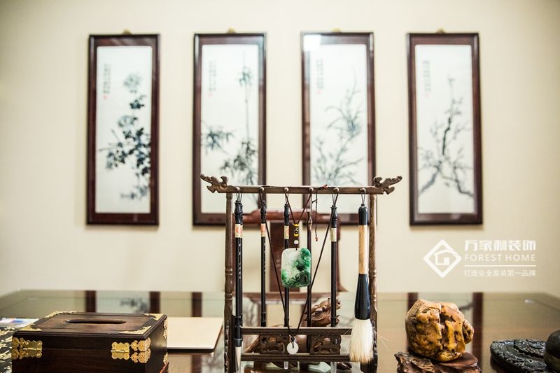 書房是全屋中式韻味展現最淋漓盡致的一處,筆墨紙硯、梅蘭竹菊點綴出溫潤與雅致的中式空間。