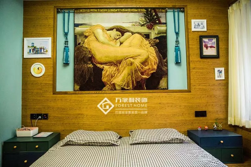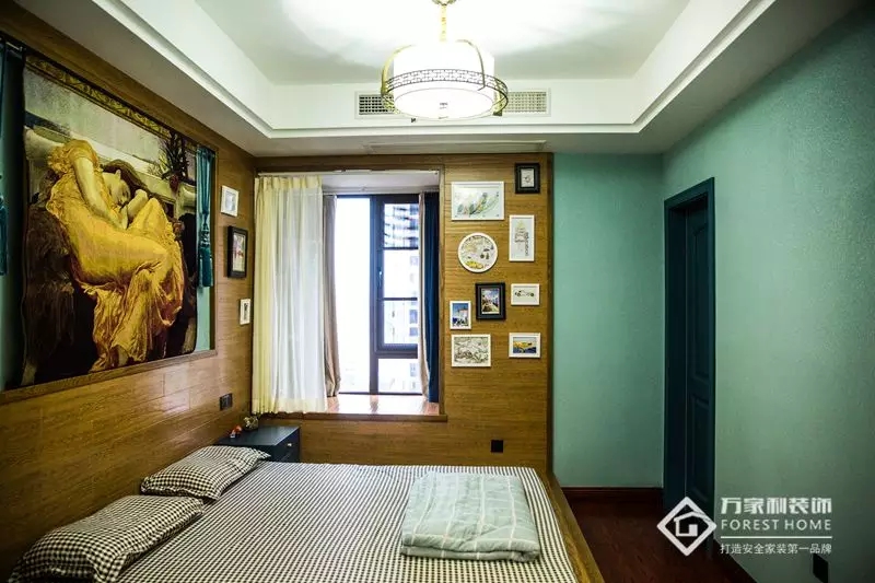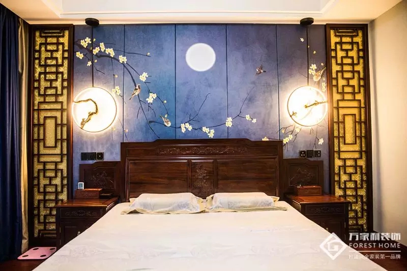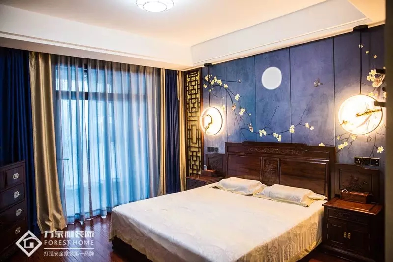 主臥風格回歸了中式,背景墻以藍色為底色,與窗簾相襯,色彩濃重而成熟,達到和諧一致,“喜上枝頭”圖案也寓意著對美好事物的憧憬與期盼。