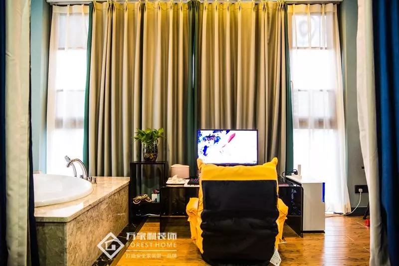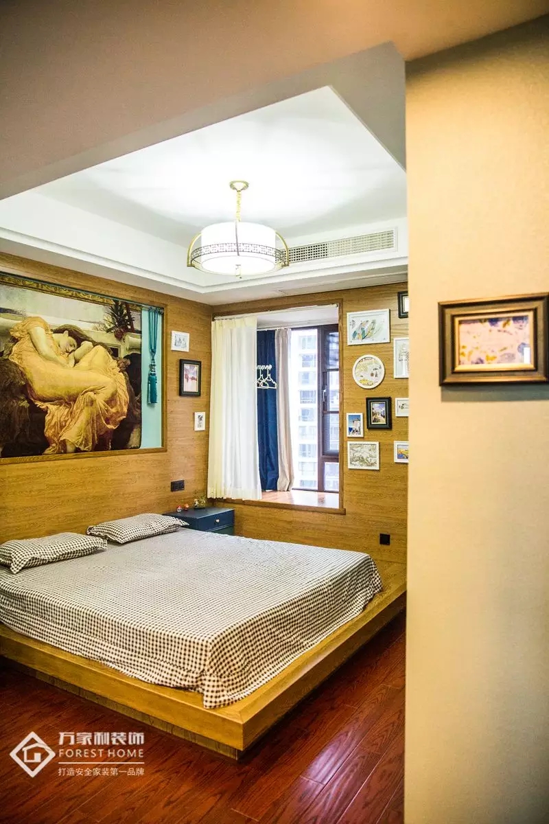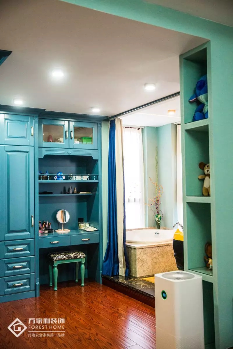 次臥設計為迎合業主女兒需求,略帶美式風格。內置景觀浴缸,旁邊利用榻榻米抬高,在這臥室之中又規劃出了一片小天地,滿足年輕人個性化追求。