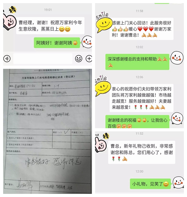 萬家利裝飾 1月感恩水電檢修月火熱進行中 小伙伴們馬不停蹄 奔波在金華各大小區 為客戶上門檢修水電 用心的服務 也換來了客戶滿滿的好評! ![]() ▲客戶好評部分截圖