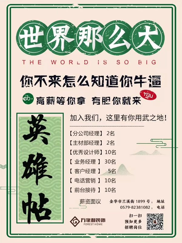 新年新氣象 新的工作征程已經(jīng)開始了, 小編懷著無比激動的心情 告訴大家 萬家利裝飾招人啦! 萬家利裝飾招人啦! 萬家利裝飾招人啦! 不管你是何方神圣 只要你有能力有經(jīng)驗(yàn) 我們隨時(shí)等你來撩 ▼