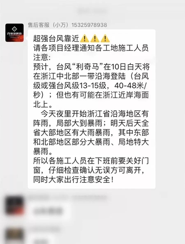 超強臺風登陸的消息 也引起了工程部小伙伴們的重視 昨天開始 對在建施工工地進行緊急通知 要求各施工人員在下班前要關好門窗 以保證業主施工現場安全