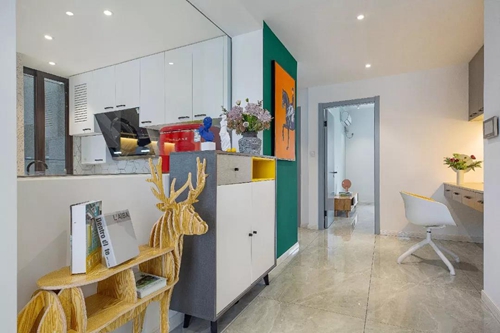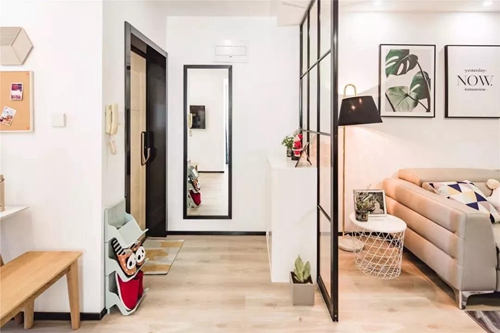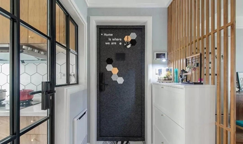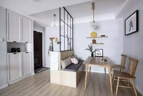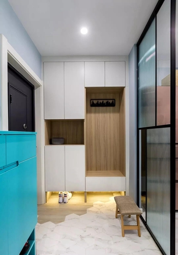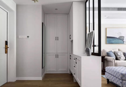 玄關采用玻璃隔斷,即擁有開闊的入戶視覺,又避免了入戶對室內空間的一覽無余,結合玄關柜使用,還增加了空間的實用性。