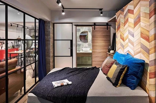 宋倩臥室的玻璃門,配以窗簾 保證了臥室居住的私密性 拉開又能讓整體空間得以放大 小戶型值得學習呀!