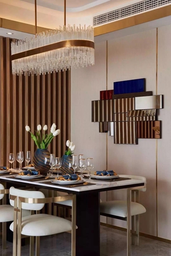 熠熠生輝的金色 可為平淡的空間增添幾分溫暖質感 在室內設計中 設計師往往利用黃銅的特殊材質和光澤 來提亮客餐廳的整體色調 使之變得更加活潑有趣、溫暖靈動