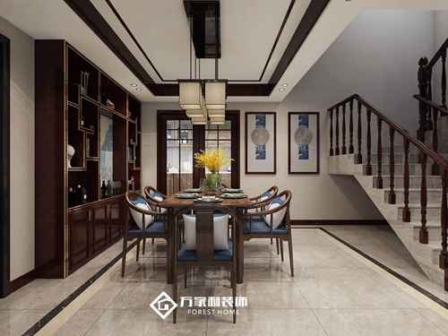 深木色是中式里比較常規的元素,這種色調與質感更能彰顯主人的穩重氣質, 軟裝配飾用亮色點綴,舒緩了中式莊重感,營造出舒適的就餐氛圍。
