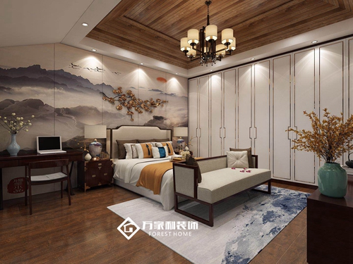 臥室化繁為簡,在造型基礎上極致簡約,采用利落的線條來勾勒層次, 更加細膩、流暢地表達傳統文化中的精髓。