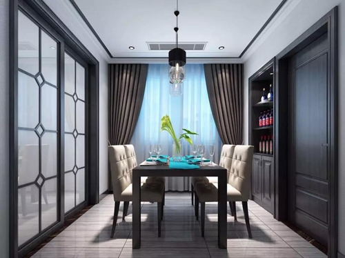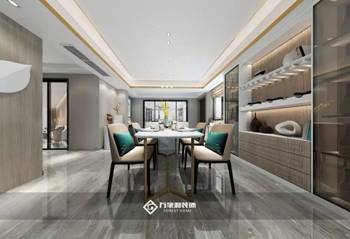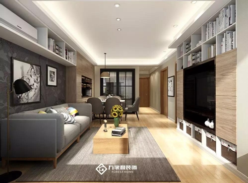 吊頂由客廳延伸,用筒燈代替主燈,空間上更加放大, 視覺上更顯溫馨,整體側柜的設計,極大地滿足了存儲需求。