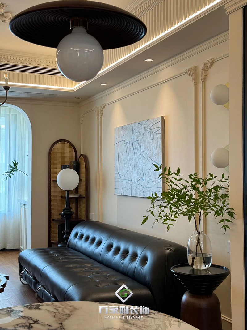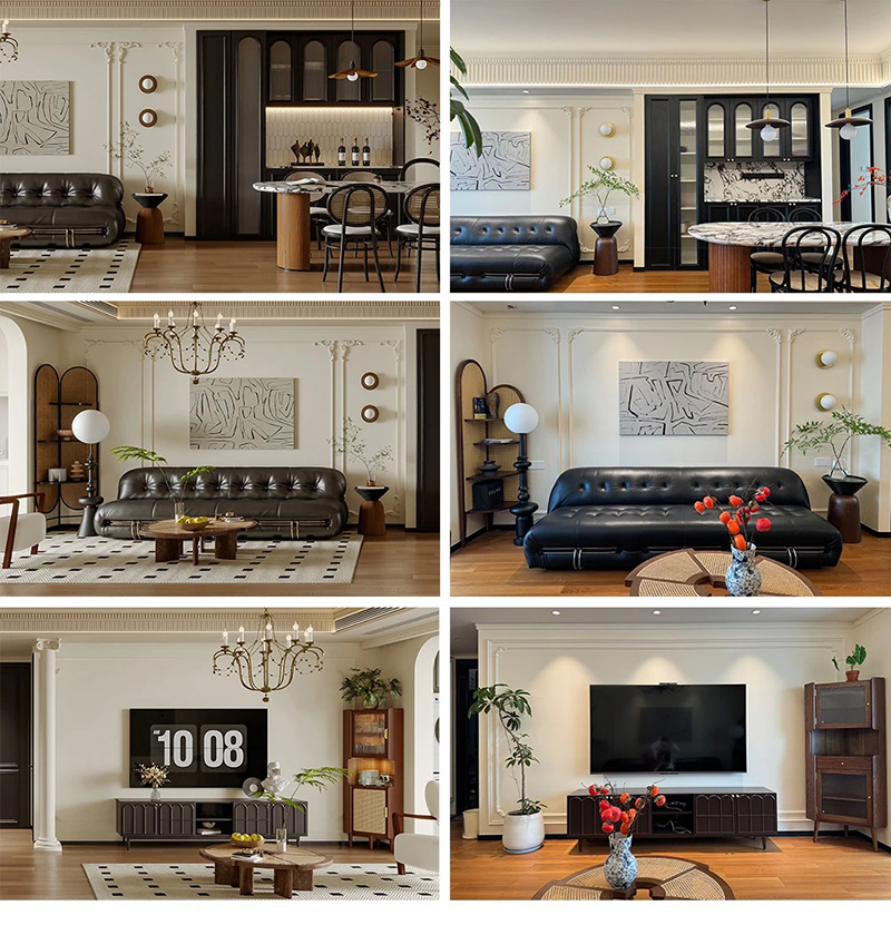 家具方面 中古風偏愛具有歷史感的款式,如皮質沙發 實木床 。同時加入一點現代的元素,大理石巖板,使空間時尚又不失復古。