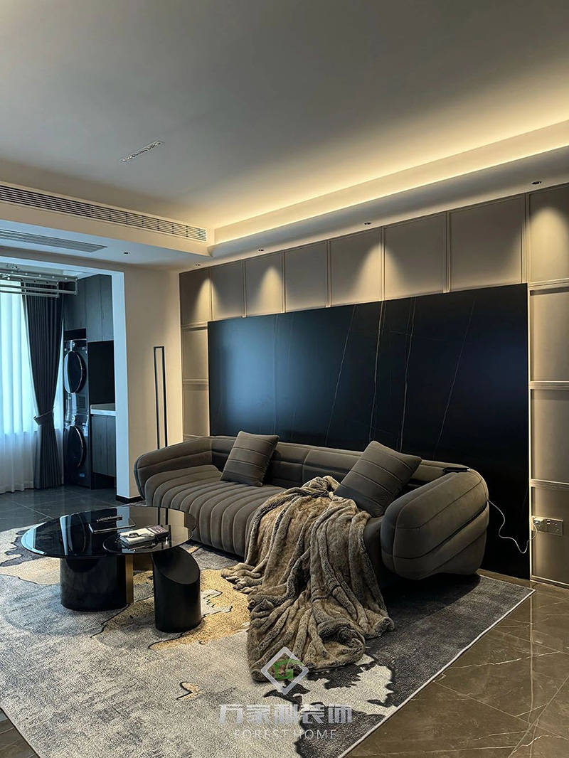 客廳選用了意大利香蕉布藝沙發(fā),低調(diào)的色彩與舒適的質(zhì)感完美結(jié)合,暗黑色調(diào)的背景與沙發(fā)柔和的線條形成強烈的對比,柔軟與硬朗相融,營造出高級感。