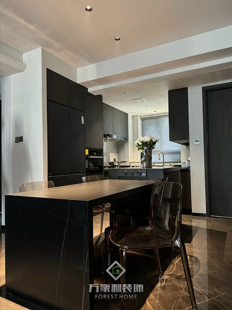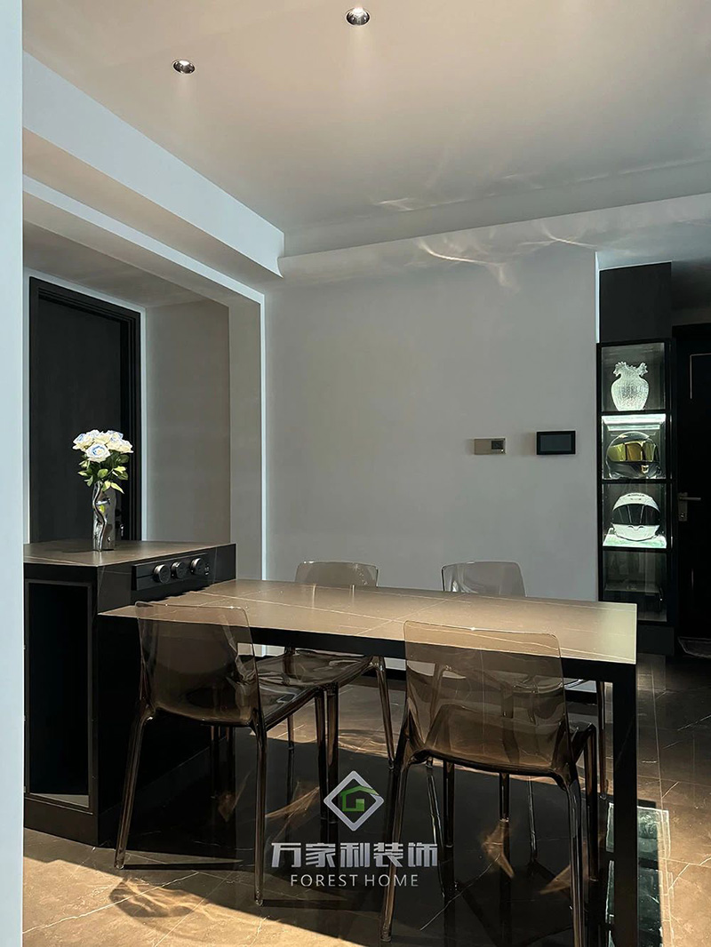餐廳的透明亞克力餐椅為暗色空間增添輕盈感,簡約設計中帶有未來感,更讓整個暗色調(diào)的空間顯得不沉悶。
