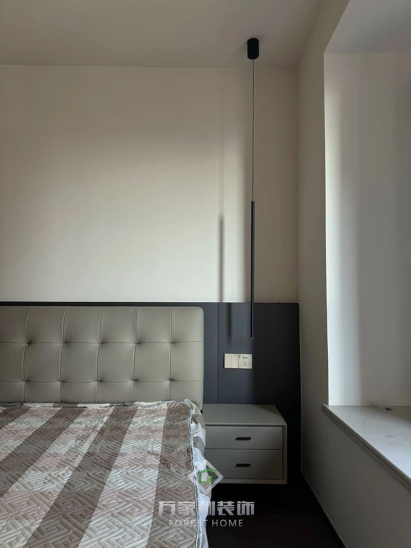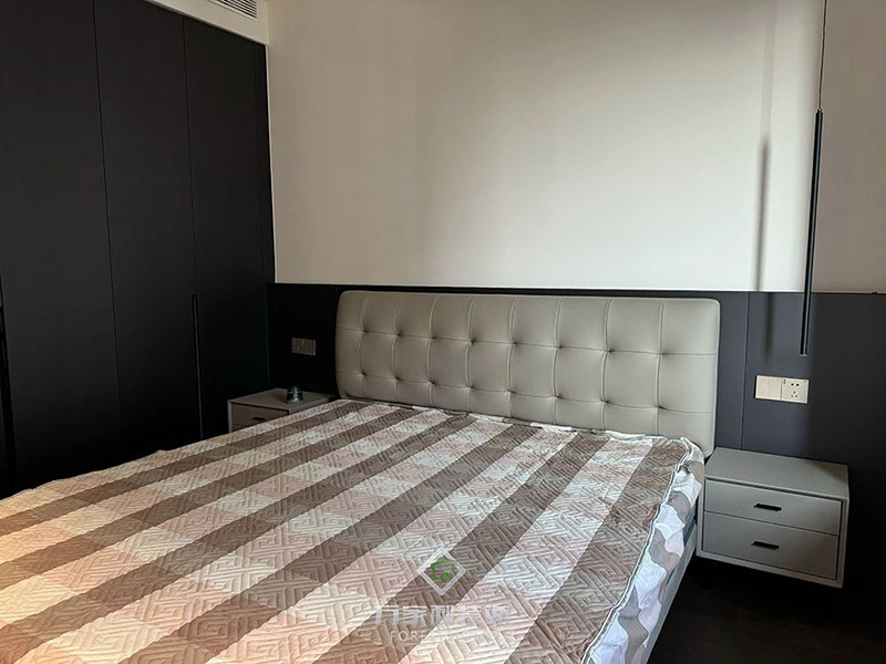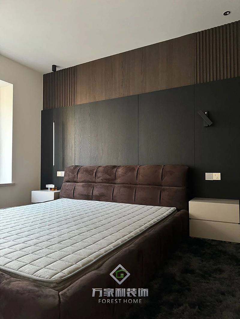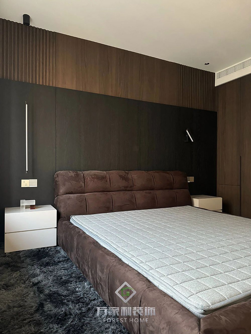 輕奢泡芙床與栗棕色木板背景墻:沉穩(wěn)溫暖的臥室氛圍,帶來極致放松體驗,打造舒適的睡眠環(huán)境。
