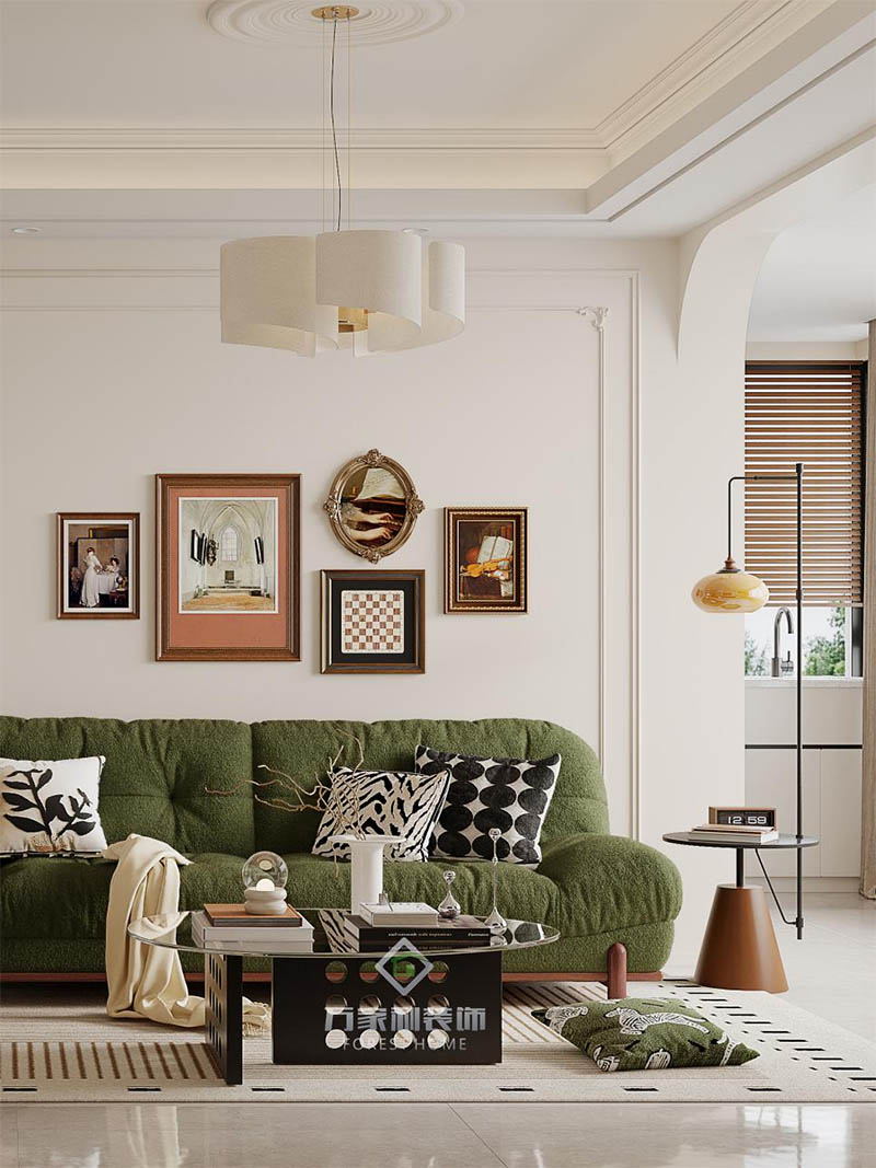 當法式復古風,遇上一眼心動的綠色沙發,像陽光透過樹影斑駁的光影讓法式復古風客廳變得很有生機活力充滿森系的復古浪漫氛圍.