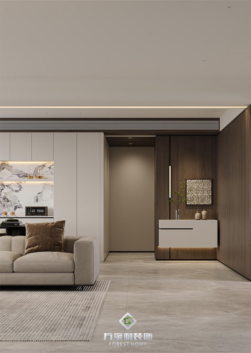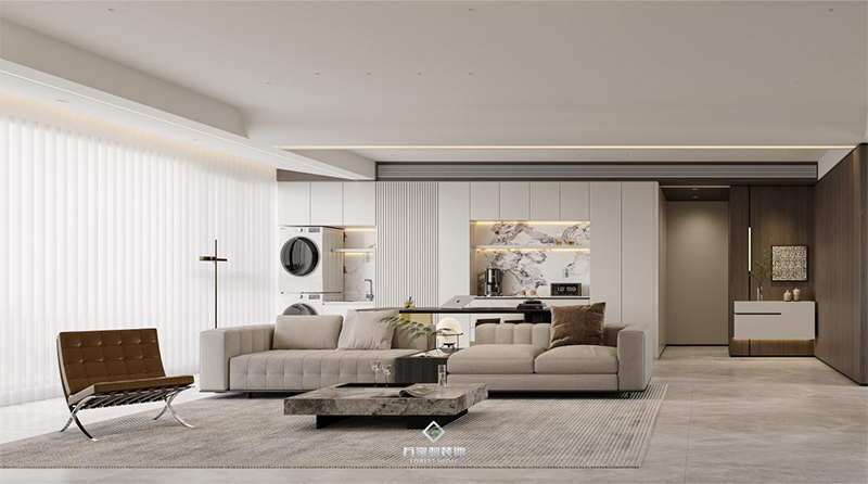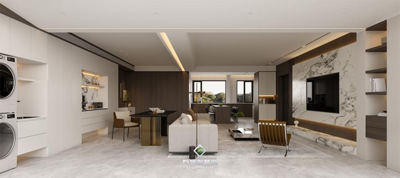 橫廳布局,沒有模板化的布局,以沙發(fā)為界,一半會(huì)客廳一半是書房,客廳功能也更為多元。