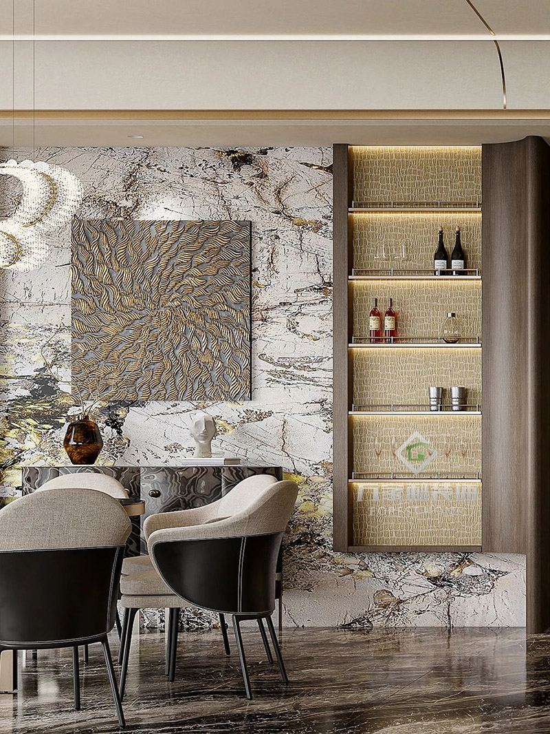 經(jīng)典高奢質(zhì)感與現(xiàn)代主義相結(jié)合,更注重空間的內(nèi)斂的奢華和神秘。整體呈現(xiàn)空間的質(zhì)感和層次感,內(nèi)斂布高級(jí),暖調(diào)燈光賦予空間沉穩(wěn)氣質(zhì),力求風(fēng)格統(tǒng)一,彰顯干凈整潔而高級(jí)。