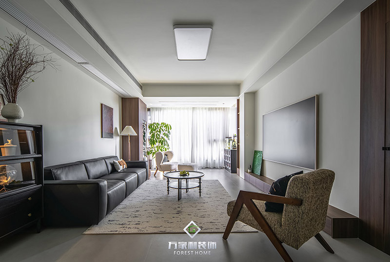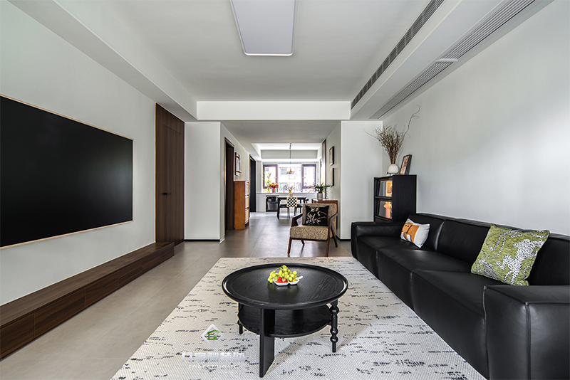 客廳中,經典的黑色皮沙發與木質裝飾相映成趣,既有復古的厚重感,又不失現代的舒適。