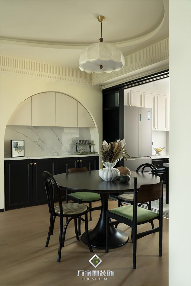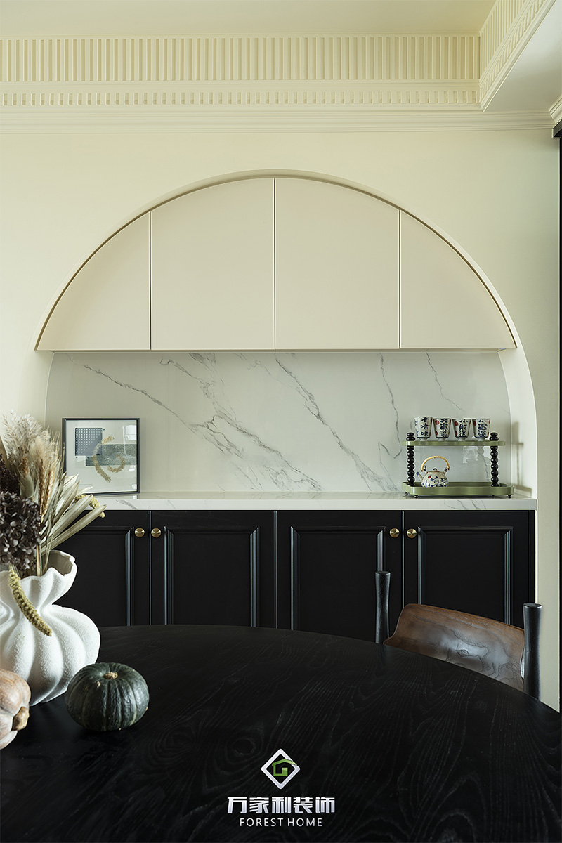 每個(gè)角度都在上演赫本式黑白電影,餐邊柜中間拱形設(shè)計(jì)成為主要亮點(diǎn),搭配獨(dú)特的寶格麗臺(tái)面巖板,這不是家具,這是穿越時(shí)空的浪漫藝術(shù)裝置。