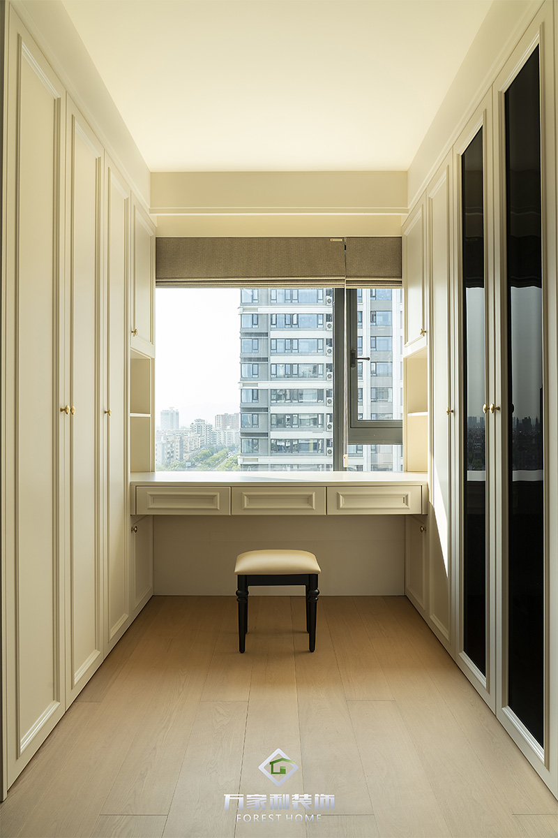 超大衣帽間是多少女孩的夢(mèng)想,兩組通頂大衣柜+懸空書桌,長(zhǎng)虹玻璃柜門透出包包首飾的輪廓。